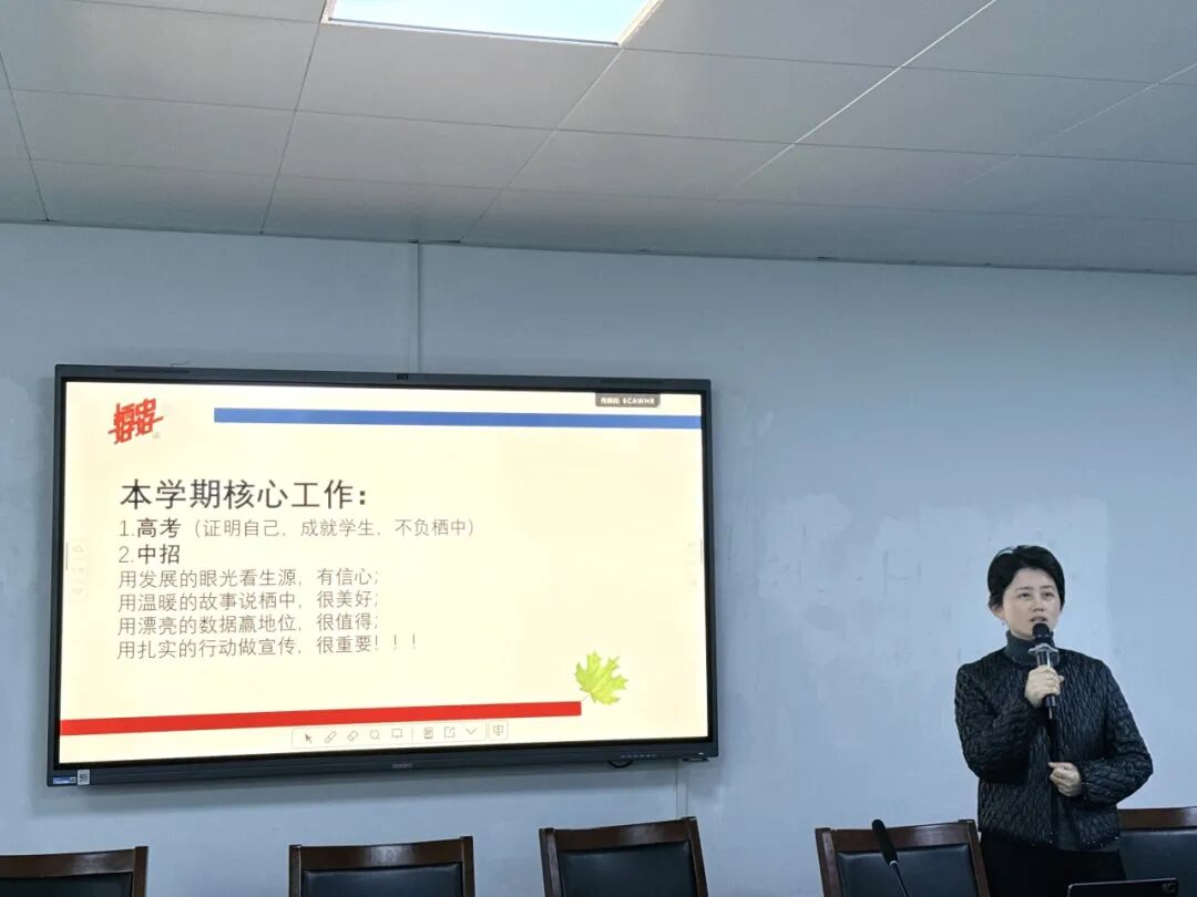 关于中招,吴校长用四句富有感染力的话语勾勒出工作路径:“用发展的眼光看生源,有信心”——要对学校发展和生源质量充满信心;“用温暖的故事说栖中,很美好”——要善于讲述校园中的感人故事,传递学校温度;“用漂亮的数据赢地位,很值得”——要用实实在在的办学成绩赢得社会尊重;“用扎实的行动做宣传,很重要”——要将宣传融入日常扎实的工作中,自然展现学校风采。