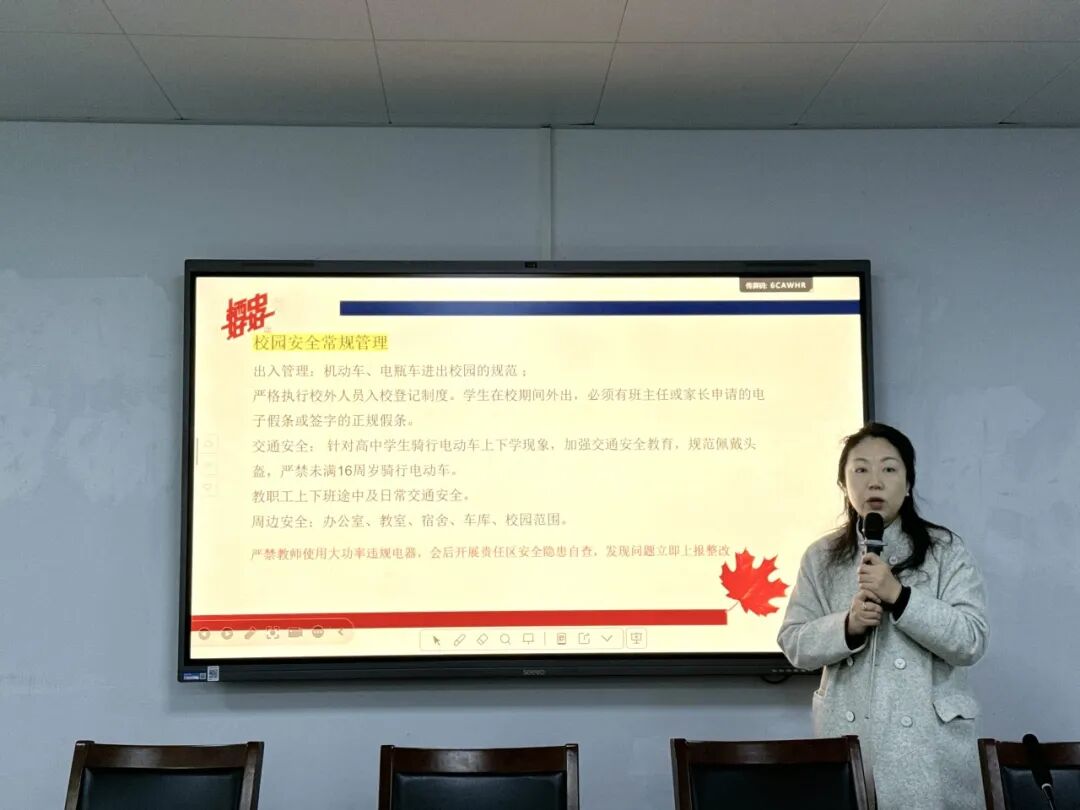 校园安全是教育事业发展的基石。会上,崔鑫副校长就本学期安全工作及中招工作进行了周密布置。他强调,必须坚持“在安全中发展,在认可中绽放”的理念,将师生安全置于首位。崔校长从校园安全常规管理、学生日常活动安全、交通安全、设施设备安全以及学生心理健康安全等多个维度进行了深入阐述。她特别指出,要加强对学生心理健康的关注与干预,确保学生身心健康成长,真正“筑牢安全基石,护航生命成长”。