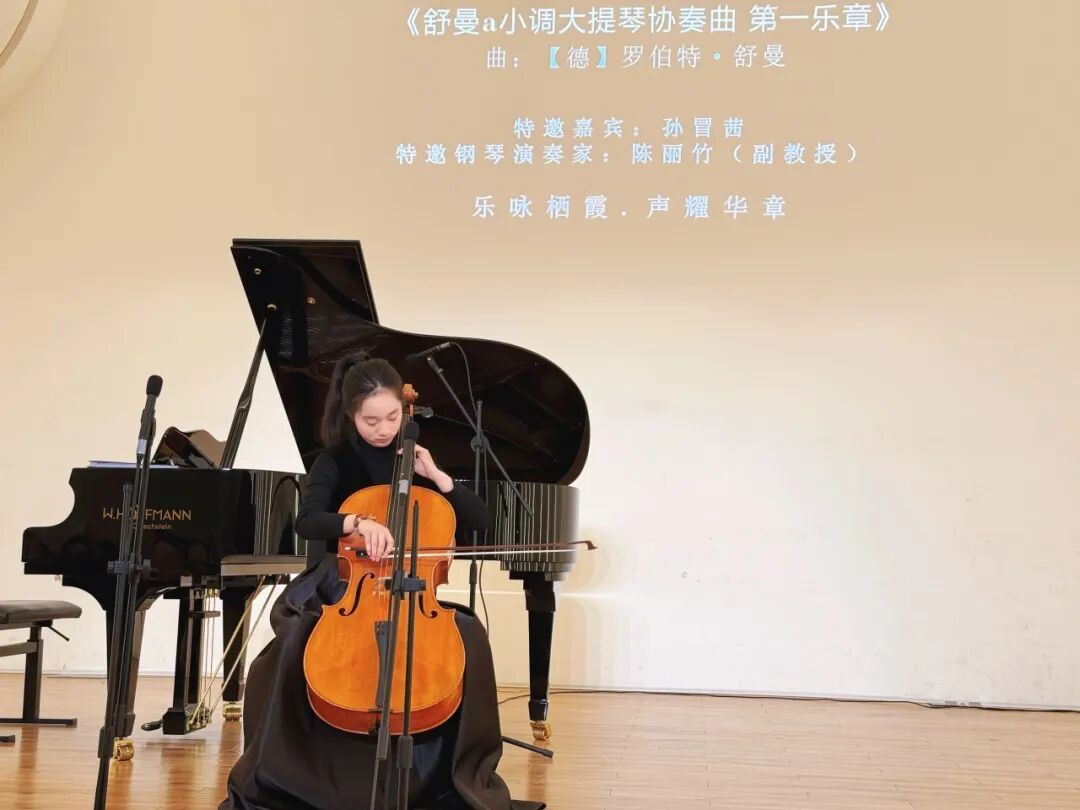 下半场演出在舒曼大提琴协奏曲的悠扬弦音后延续精彩。《在我的心里》《蝶恋花》《阿里奥佐·娜塔莎》等曲目,既彰显了声乐艺术的古典之美,也体现了学校国际化美育的探索成果。尤其是学校作为“中俄未来人才培养计划江苏省俄语课程试验基地”,通过俄罗斯经典作品的演绎,让美育的种子跨越国界生长。
