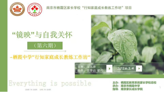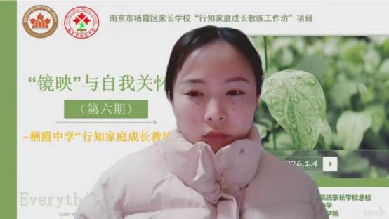 家庭教育是一场双向的奔赴,是家长与孩子共同成长的旅程。为帮助家长缓解育儿焦虑,学会以平和的心态应对亲子相处中的矛盾与冲突,2026年1月4日晚上7:30-9点,栖霞中学行知家庭成长教练工作坊以线上形式开展“镜映与自我关怀”主题活动,由王苏萍老师担任主持人,贾梦洁老师和梁巧老师担任助教,众多家长齐聚云端,在交流与体验中探寻亲子沟通的智慧,收获自我成长的力量。